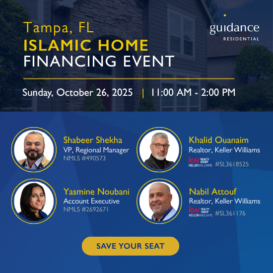 Join Guidance Residential and Keller Williams Realty on October 26 in Tampa, FL, for an event on Islamic Home Financing. Learn how to achieve Shariah-compliant [..]