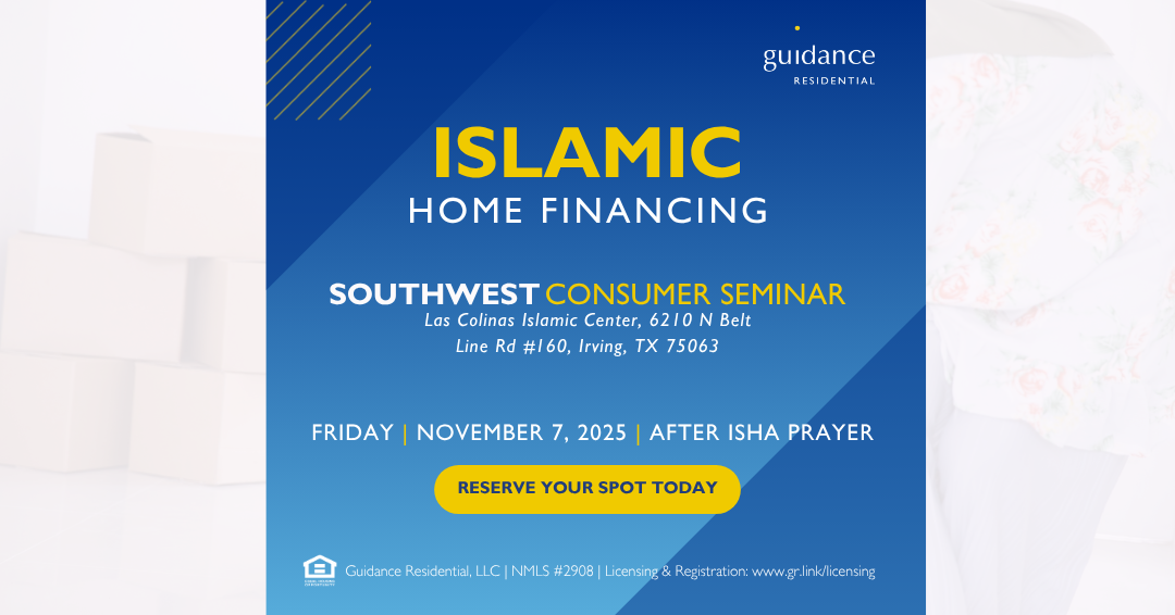 Attend our Islamic Home Financing event at Las Colinas Islamic Center on Nov 7th. Learn about Shariah-compliant home ownership with Guidance Residential. Register now!